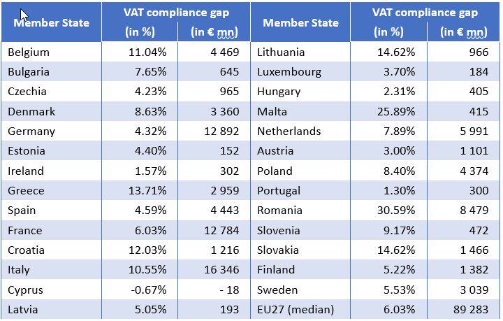Nominal belief sich die Gesamtlücke beider Einhaltung der Mehrwertsteuervorschriften in der EU im Jahr 2022 auf 89,3 Mrd. EUR, was 7 Prozent der theoretisch erwarteten Mehrwertsteuereinnahmen entspricht. Gegenüber 2021 erhöhte sich die Lücke um 13,3 Mrd €.