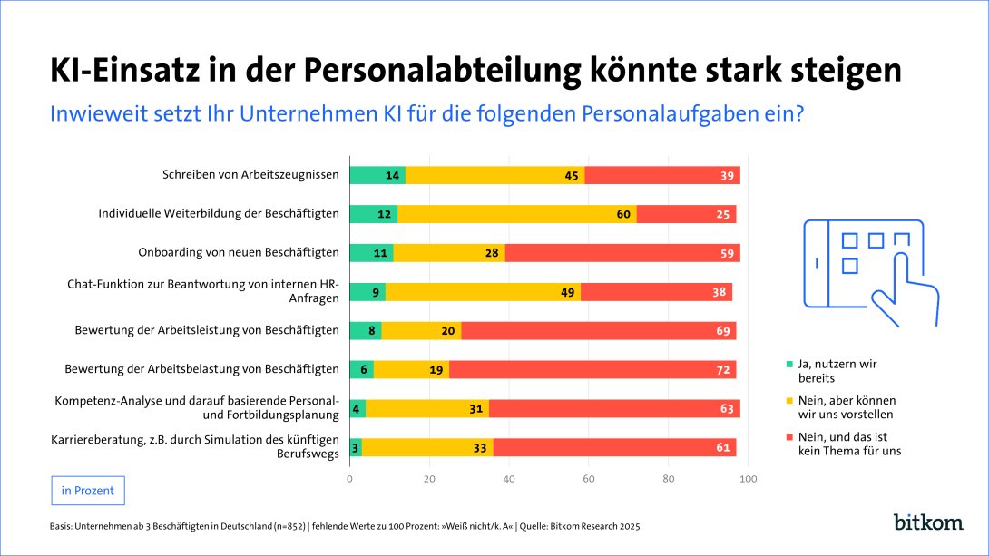 Ein Arbeitszeugnis, die schnelle Antwort auf Fragen zur Urlaubsregelung oder aber eine individuelle Fortbildungsplanung – künftig werden viele Aufgaben der Personalabteilung mit Hilfe von Künstlicher Intelligenz erledigt. Zwar setzt bislang nur eine Minderheit KI für solche Aufgaben ein, aber das Interesse ist hoch, wie eine Befragung von 852 Unternehmen in Deutschland im Auftrag des Digitalverbands Bitkom zeigt. Demnach werden erst in 14 Prozent der Unternehmen Arbeitszeugnisse mit KI-Unterstützung verfasst, aber 45 Prozent können sich das für die Zukunft vorstellen. 12 Prozent nutzen derzeit KI für die individuelle Weiterbildung von Beschäftigten, aber 60 Prozent sind dafür künftig offen. Und 11 Prozent nutzen aktuell KI-Tools für die Einarbeitung neuer Mitarbeiterinnen und Mitarbeiter, 28 Prozent können sich dies für die Zukunft vorstellen.